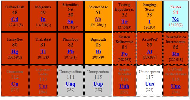 There you'll find over 100 different science blogs, covering topics from astrobiology to zoology. While the blogs aren't listed in topical groups similar to how the elements on the real periodic table are grouped, most are listed as an element whose abbreviation comes close to the blog or blogger's name. For example, Universe Today is listed as "Uut – Ununtrium." Check out this