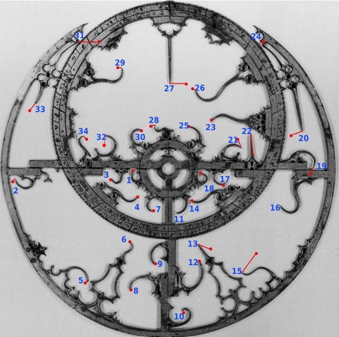 But perhaps most importantly, astrolabes have "pointers" that, when placed against the sky, would represent the position of a particular set of stars. The astrolabe Dr. Davoust studied has 34 of these, though none are named.
