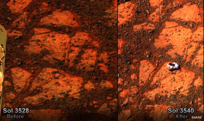 "One theory is that we somehow flicked it with a wheel," Squyres said. "We had driven a meter or two away from here and somehow maybe one of the wheels managed spit it out of the ground. That's the more likely theory."
