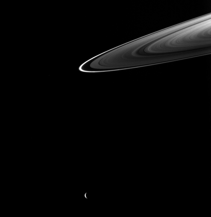 of the Saturn system during equinox, and followed up with this beauty of a crescent moon Rhea beneath the rings of Saturn. NASA has also put together a multimedia presentation of recent pictures of Saturn, set to music, and it is stunning. Run, don't walk and