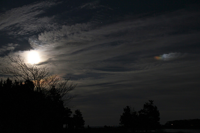 Moondogs can appear colorful like a Sundog or 'shine' with a light similar to the Moon.
