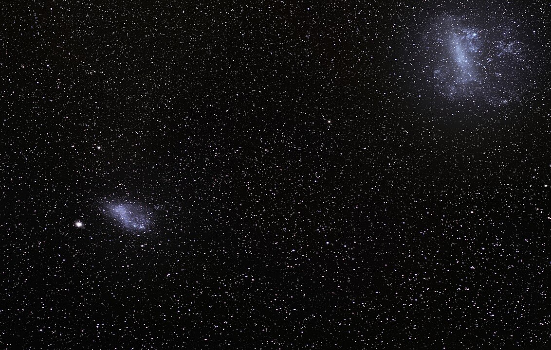 The Magellanic Clouds are two irregular dwarf galaxies visible from the Southern Hemisphere that orbit our own Milky Way Galaxy. Named after the explorer Ferdinand Magellan who documented them during his voyage in the 16th century, they consist of the Large Magellanic Cloud (LMC) and the Small Magellanic Cloud (SMC). Located approximately 160,000 and 200,000 light-years away respectively, these satellite galaxies are rich in gas and young stars. The Magellanic Clouds are connected by a stream of gas called the Magellanic Bridge and are slowly being torn apart by tidal forces from our galaxy, with the material forming the trailing Magellanic Stream that extends across much of our southern sky.