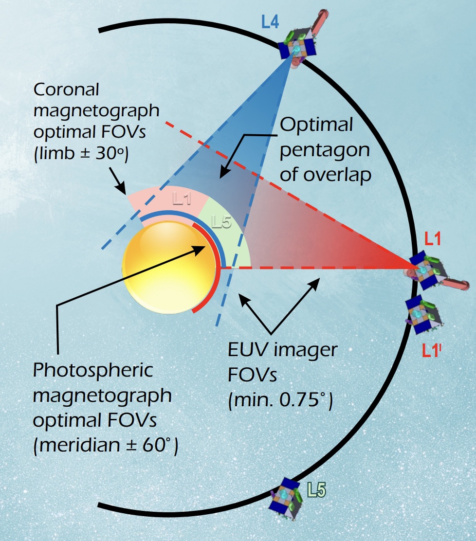 The mission, called COMPLETE (which does not appear to be an acronym), would send satellites to several different Lagrange points in the Earth-Sun system. L4 and L5 (the trailing and leading Lagrange points) would each get one probe, and L1, which is much closer to Earth, would get two. Each of these probes could be launched on a Falcon Heavy rocket sometime near 2032, the expected height of the next 11-year solar cycle.