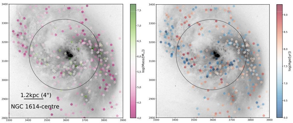 The researchers designate a radius in each merger called R80 where 80% of star formation is occurring. Within that 80% radius the mergers are the most efficient at forming star clusters. This radius also contains the youngest star clusters around 10 million years old. As these clusters age, they are displaced by the tidal forces of the collision and drift to different regions of the galaxies.