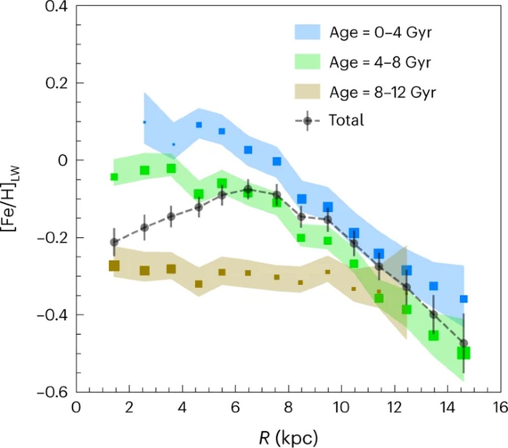 *This figure from a 2023 paper illustrates the reverse metallicity gradient in the Milky Way. It's binned by groups of stars with different ages. Image Credit: Lian et al. 2023 NatAstr*