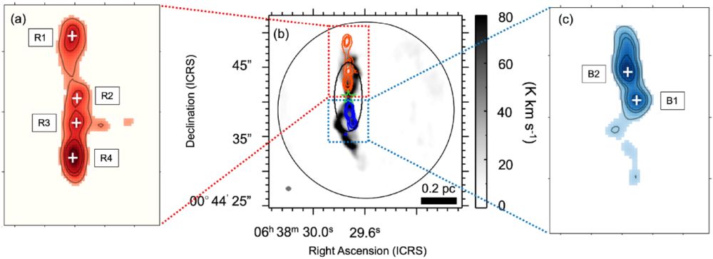 *This figure from the research explains some of the findings. (a) shows the red-shifted jet travelling away from us, and (b) shows the blue-shifted jet travelling toward us. The white crosses are the "bullets" in the jets that represent episodic mass ejection events. These events are integral to star formation. Image Credit: Ikeda et al. 2025. ApJ*