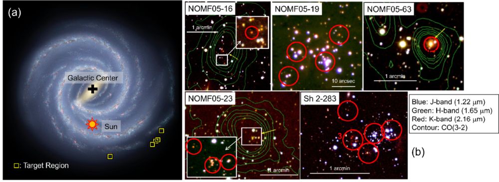 *This figure from the research shows the positions of the target star-forming region in the Galaxy and the near-infrared color composite images of the targets. (a) The target positions are represented as the yellow rectangles. The background is an artist’s conception of the Milky Way (R. Hurt/NASA/JPL-Caltech/ESO). (b) The positions of the target protostellar candidates are indicated by the red circles. The numbers of sources are labeled when multiple sources are enclosed. Image Credit: Ikeda et al. 2025. ApJ*
