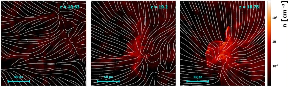 *These images from the simulation show the formation of a dark matter mini halo and how gas falls into its gravity. The lines show the direction of the gas's movement. Initially, the gas is spread out and smooth. As the mini-halo forms, the gas becomes more concentrated and flows toward the halo. The third image shows the emergence of thread-like clumps created by the uneven flow of gas toward the halo. Image Credit: ASIAA/Meng-Yuan Ho & Pei-Cheng Tung*
