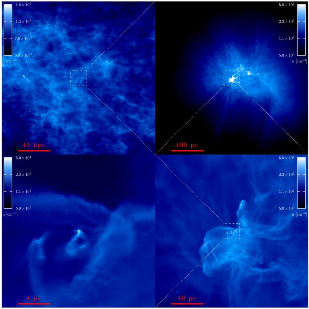 *These images from the simulation show the morphology of a primordial minihalo at z = 18.78. The panels show successive zoom-ins of the gas density from a scale of 40 kpc down to the inner 4 pc of the targeted halo. Clumpy structures become increasingly prominent at smaller scales. In the 4 pc panel, the central region exhibits an elongated dense clump surrounded by a tail of circularly streaming gas, highlighting the complex, anisotropic dynamics within the collapsing core. Image Credit: ASIAA/Meng-Yuan Ho & Pei-Cheng Tung*