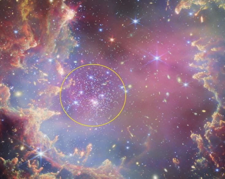 This image lives up to the standard the JWST has set. NGC 602 is inside a nebula of multi-coloured gas and dust. The many energetic stars in the cluster light the nebula up from within, while its outer edges are dark. The cluster is rich in ionized gas, which indicates that star formation is still taking place.