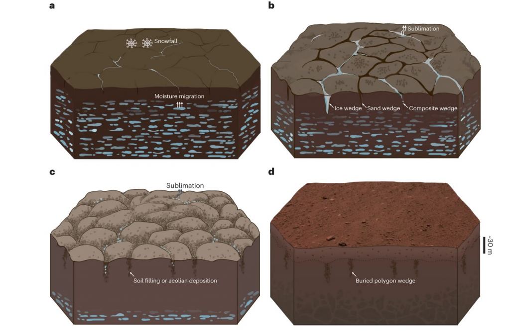 "The possible presence of water and ice required for the freeze–thaw process in the wedges may have come from cryogenic suction-induced moisture migration from an underground aquifer on Mars, snowfall from the air or vapor diffusion for pore ice deposition," the paper explains.
