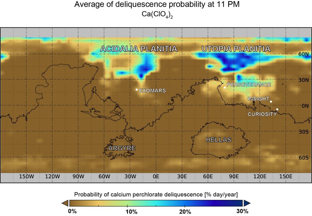 "Our results suggest that there is a good chance for calcium perchlorate deliquescence across larger regions on Mars, and the possibly ideal times are spread across several hours," they explain. "Our deliquescence probability maps could be used as a good startings point in finding interesting locations for local ephemeral brine studies or as a preliminary guide in planning future, liquid brine-related in-situ missions."