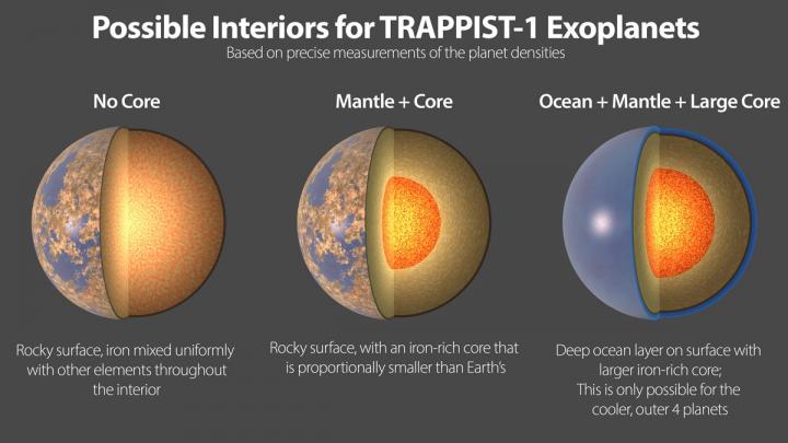 First, there could be slightly less iron in them compared to the Earth. Since most of the Earth's iron is found in its core, this would imply that the core of these TRAPPIST worlds would have a smaller core than that of Earth.
