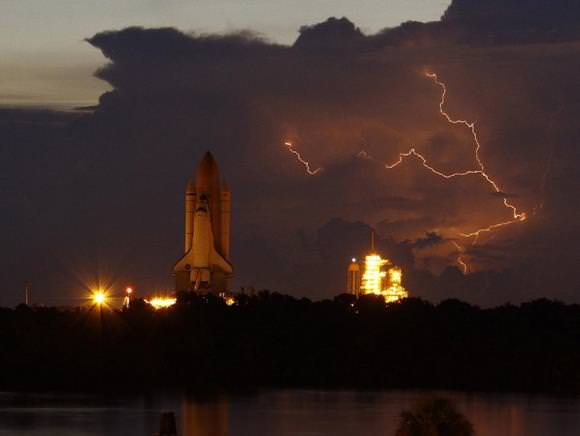 [/caption] Yikes! No wonder the rollout of space shuttle Discovery took a little bit longer than usual. Lightning lit up the sky above Kennedy Space Center early Tuesday morning, providing a stunning backdrop for the shuttle's crawl to the launchpad. Usually the trip takes about six hours, but various weather-related concerns slowed the move out past 11 hours. Lightning delayed Discovery's exit from the Vehicle Assembly Building for about 2 hours, and then mud from recent thunderstorms forced the crawler to stop repeatedly so engineers could clean out the giant treads on the huge 5.5 million-pound (2.4 million-kg) vehicle that hauls shuttles out to the launch pad. Discovery is scheduled to launch on August 25 for the STS-128 mission to the ISS. Of interest is that this mission will bring the C.O.L.B.E.R.T treadmill to the station, an exercise device named after comedian Stephen Colbert.