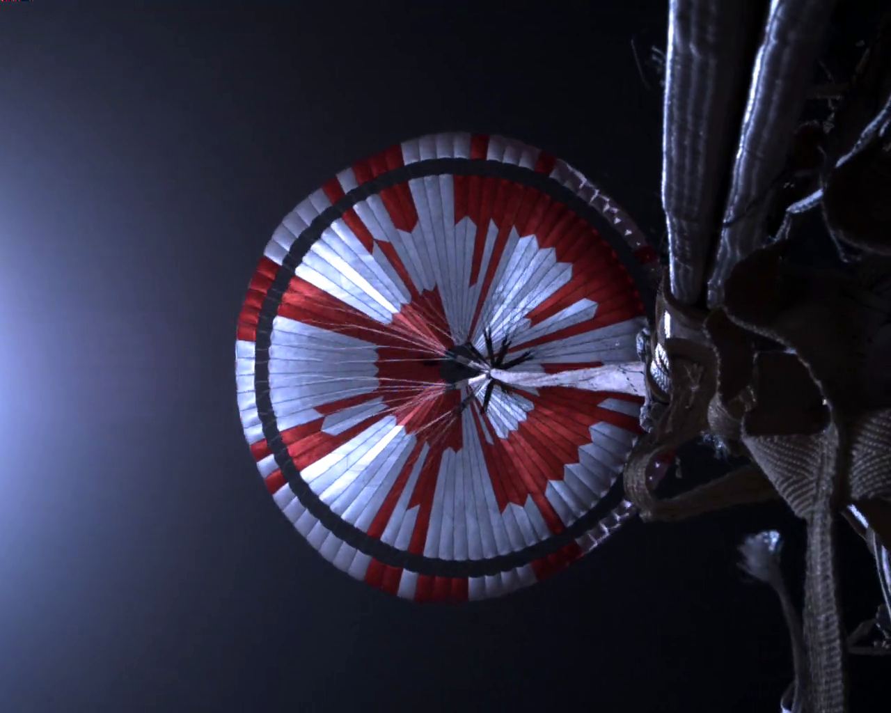 Hidden in the 70-foot (21-meter) parachute's red and white pattern was a binary code with the phrase "Dare mighty things" -- a famous expression from President Theodore Roosevelt, espoused by those who work at the Jet Propulsion Laboratory. The outer rings of the pattern also feature GPS coordinates for JPL's offices in Pasadena, California: 34°11'58" N 118°10'31" W.