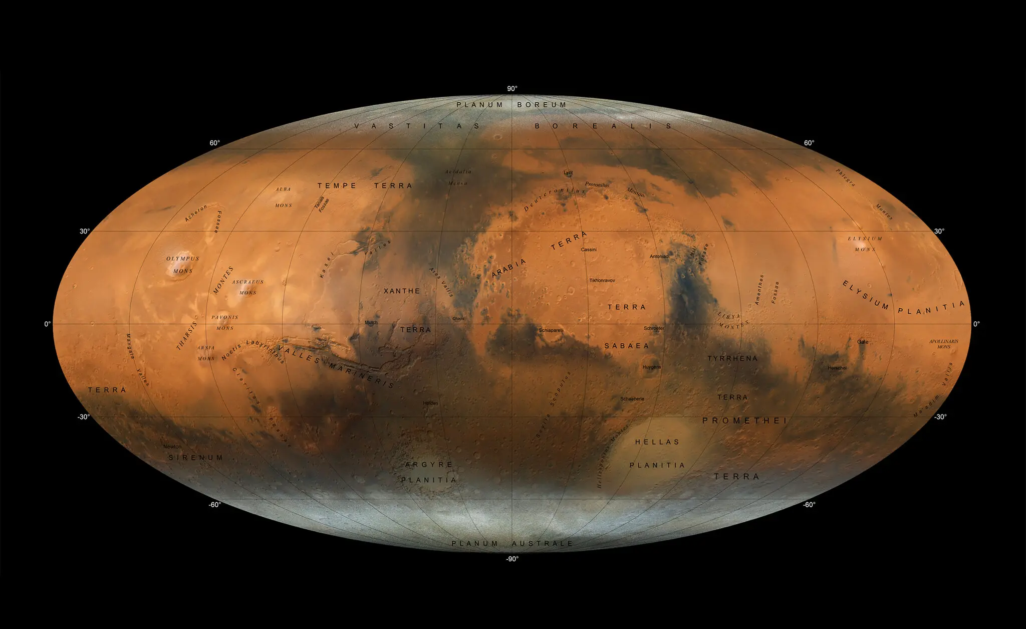A full globe image of Mars showing its many features
