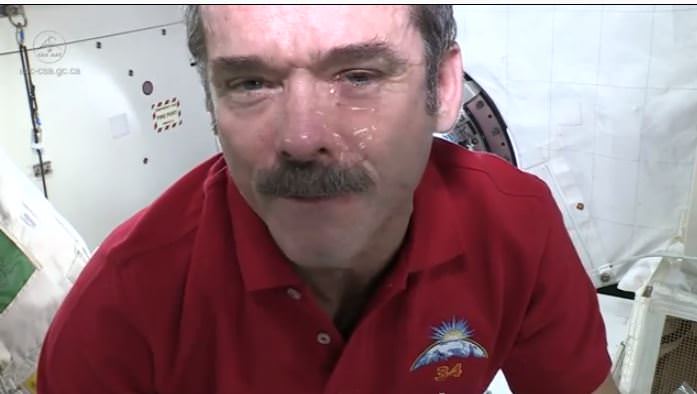 No tears in heaven? Expedition 35 Commander Chris Hadfield shows that while you really can cry in space, tears don't fall like they do here on Earth, and instead just end up as a big ball of water on your face. It's physics, baby!