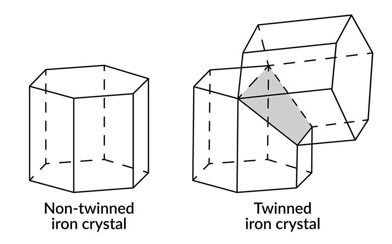 Twinning is when atoms rearrange themselves so that they share crystal lattice points symmetrically. Different materials exhibit different types of twinning, all governed by well-understood laws. In iron's case, the hexagonal prisms rotate to the side nearly 90 degrees. The point of attachment is called the twin plane or the compositional surface.