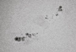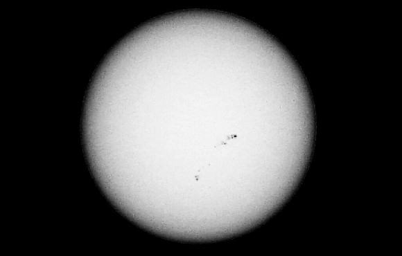 A black-and-white view of the string of sunspots facing Earth right now. Credit: Paul M. Hutchinson[/caption]