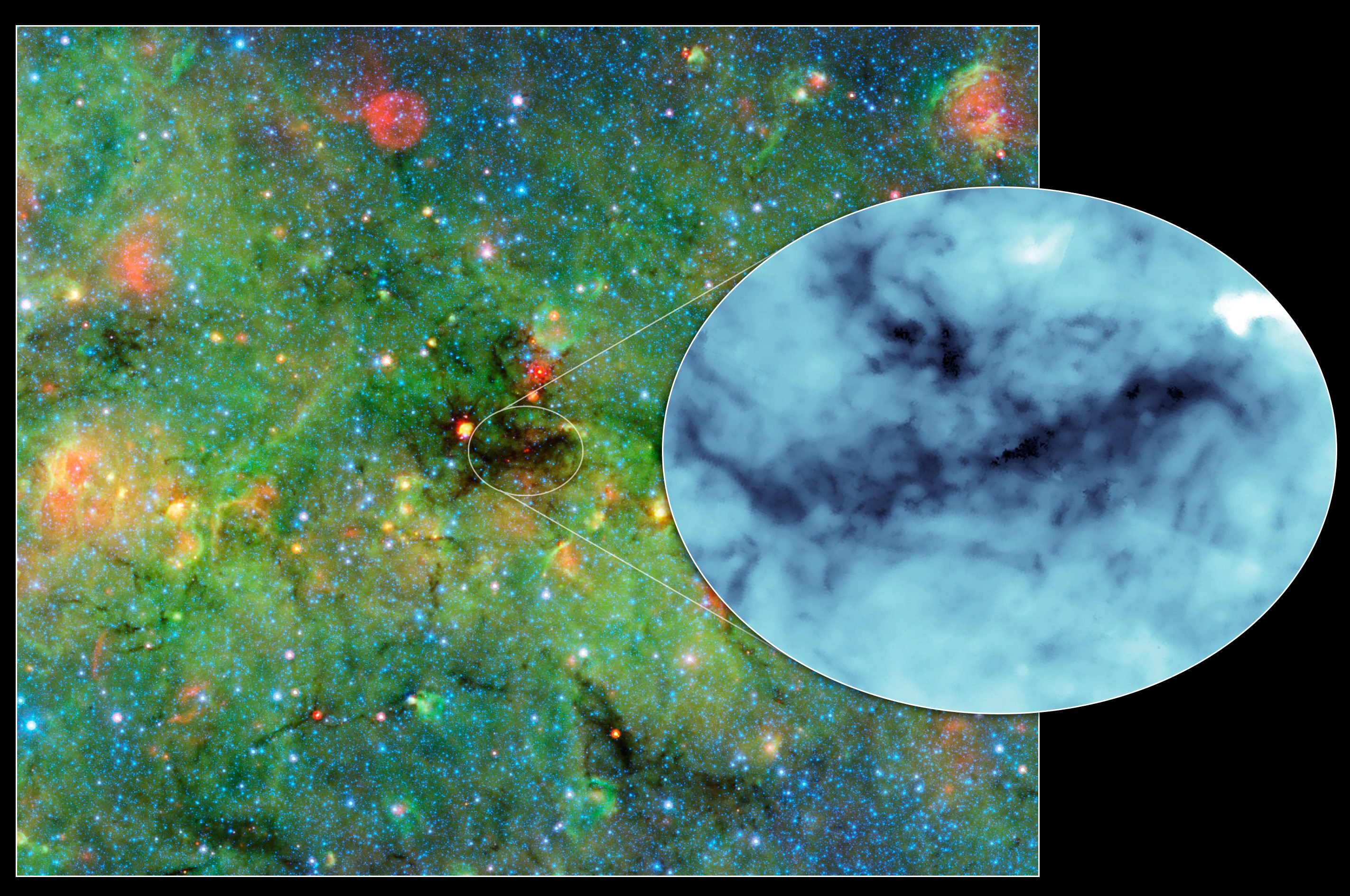 The new study, which included observations from NASA's Spitzer Space Telescope, examined the shadows these clumps cast and concluded this cloud is about 7,000 times more massive than the sun, and about 50 light-years in diameter. Because Spitzer examines the universe in infrared light, this allows it to peer through dusty areas that are difficult or impossible to see in visual light, allowing Spitzer to examine different astronomical phenomena.