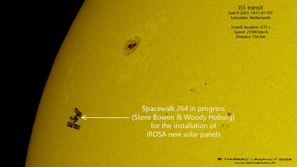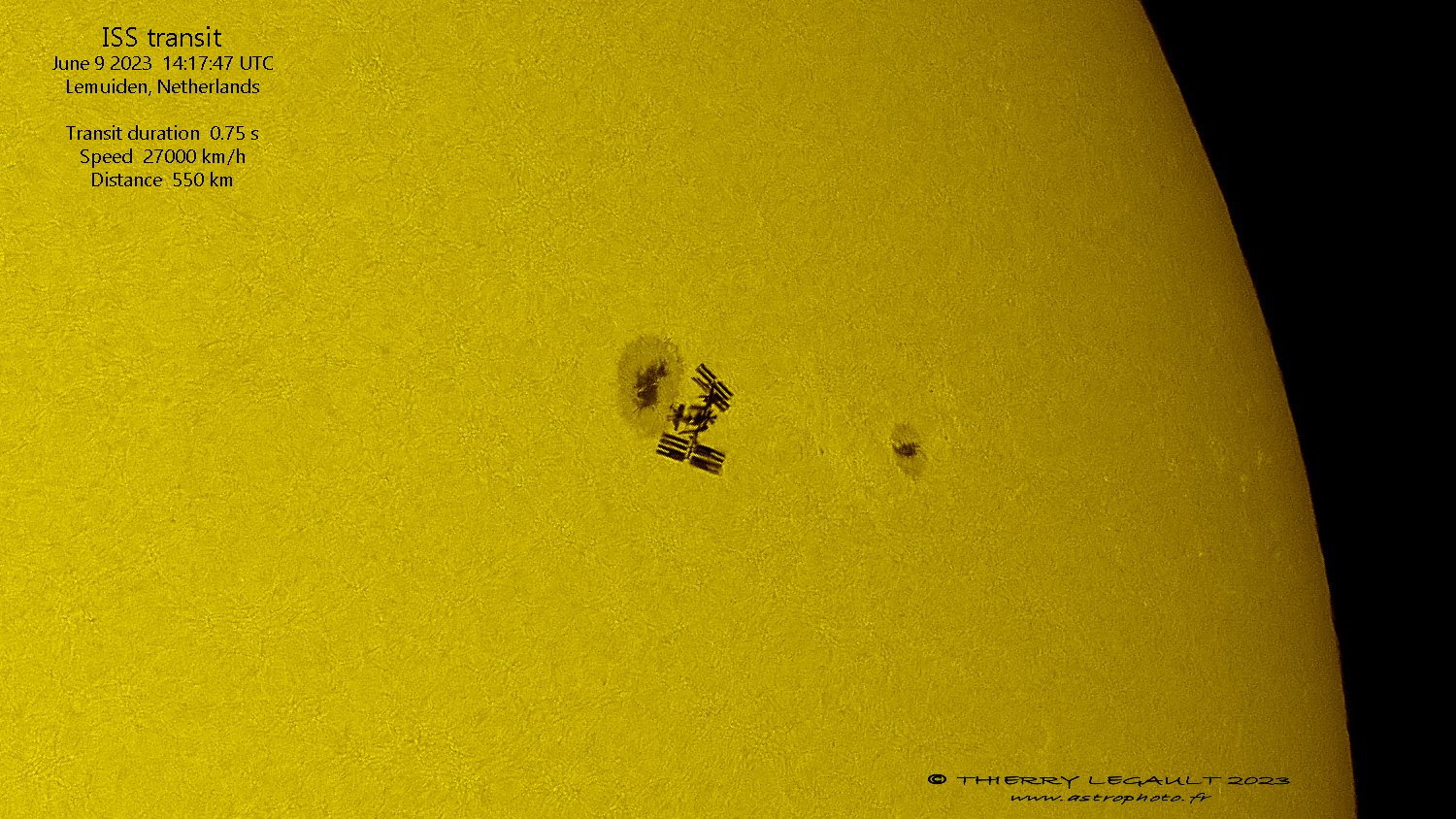"For the occasion, I drove 6 hours from home to go to the Netherlands where a transit happened one hour after the spacewalk started," Legault said on Facebook. "This time, the ISS passed in front of 3 sunspots groups in a split second! The big sunspot could swallow the Earth, but it is 300,000 times farther than the ISS (150 million km versus 550 km)."
