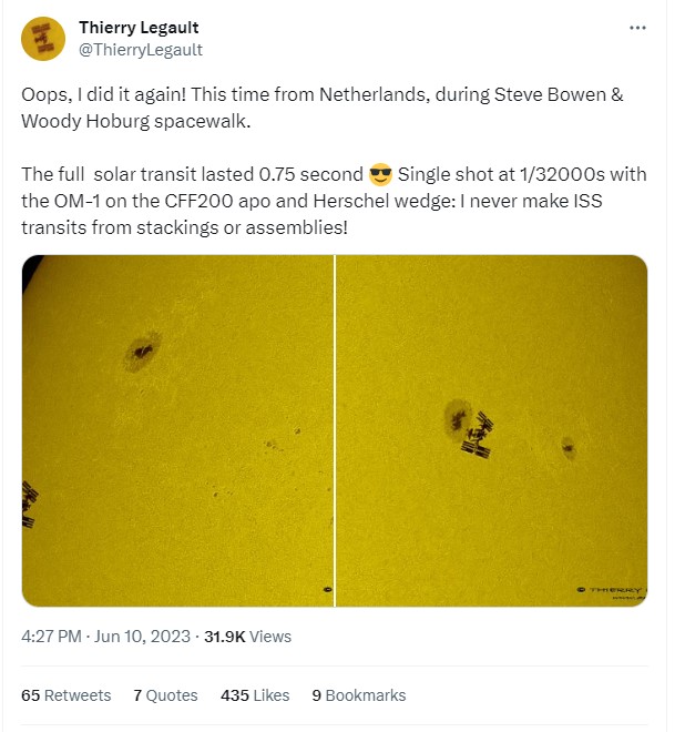 Now, he was able to take pictures of the ISS transiting the Sun while two astronauts were doing a spacewalk. As an added challenge, Legault made sure he was in the right place at the right time so he could capture the ISS (and astronauts) while they were passing by three enormous sunspots.