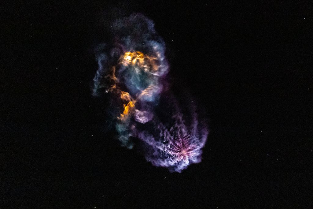 "This image occurred at booster separation and boostback-burn startup. The cloud with the purple/yellow glow in it is the 2 boosters firing up their engines to slow their forward momentum and begin their burn back towards the landing zones at the cape. The center core stage is on the bottom right side and is shown still on its main burn propelling the second stage for about another minute. The reason you get these incredible visuals is, from my understanding, at that altitude there is very little atmosphere so the exhaust clouds from the boosters expand much larger and contrast against the dark night sky."