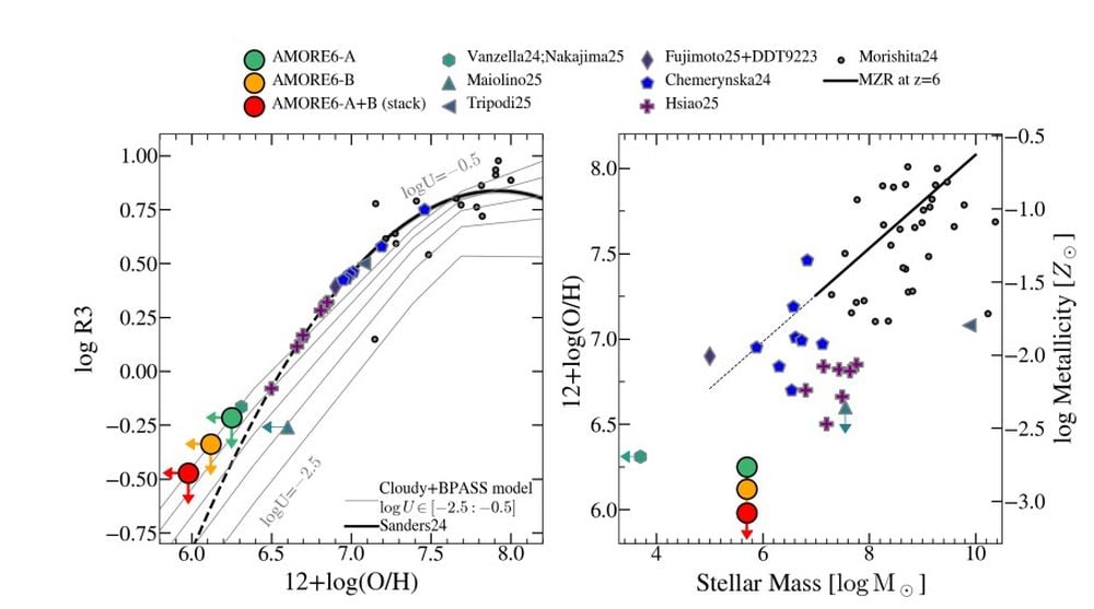 *The left panel shows the weak OIII emissions for AMORE6. Since it's observed through a gravitational lens, there are data points for AMORE6 A, AMORE6 B, and AMORE A & B stacked. The x-axis shows a common way of measuring a galaxy's metallicity by comparing Oxygen with Hydrogen, since Oxygen is the most abundant metal produced by stars. (12+ log (O/H)) The graph also shows other galaxies from the same age range. It's complicated, but it shows that AMORE6 is more pristine and has very low metallicity compared to the others. Image Credit: Morishita et al. 2025. Nature*