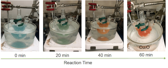 The key to the process (which Wu and his colleagues have been working on since 2015) is cuprous oxide, a cheap red powder that is chemically engineered to have as many eight-sided particles as possible. This powder is created by a chemical reaction when glucose, copper acetate, sodium hydroxide, and sodium dodecyl sulfate are added to water that has been heated to a specified temperature.