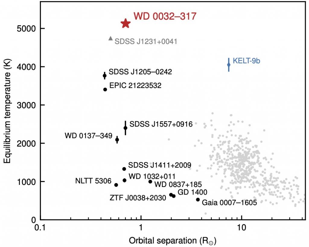 This object, which orbits the white dwarf star named WD-0032–317, straddles the line between a being a brown dwarf and a so-called hot-Jupiter exoplanet. If classified as a hot Jupiter, it readily surpasses the exoplanet that was previously thought to be the hottest ever detected, KELT-9b at 4,600 K.