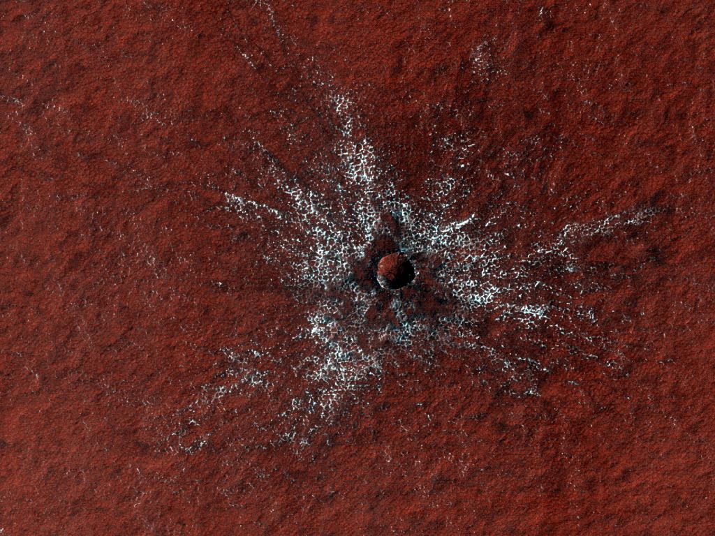 Here's a new impact crater that was seen by the Mars Reconnaissance Orbiter. Exactly when the crater formed is not known, but this image was taken on July 24, 2020 and in a previous image of this site taken in 2018, the crater is not there.