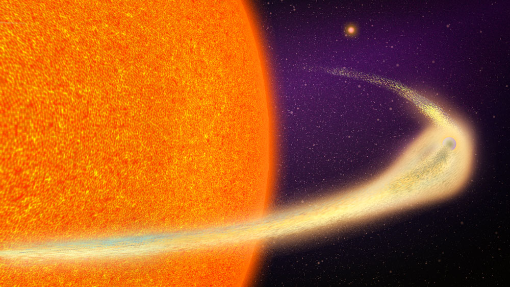 If we need more evidence that our Solar System is not representative of other solar systems, take a look at BD+05 4868. It's a binary star consisting of a K-dwarf and an M-dwarf about 140 light-years away. It's not just the binary star sets the system apart from ours. A small rocky planet is so close to the primary star that it's being vaporized, leaving a trail of debris like a comet.