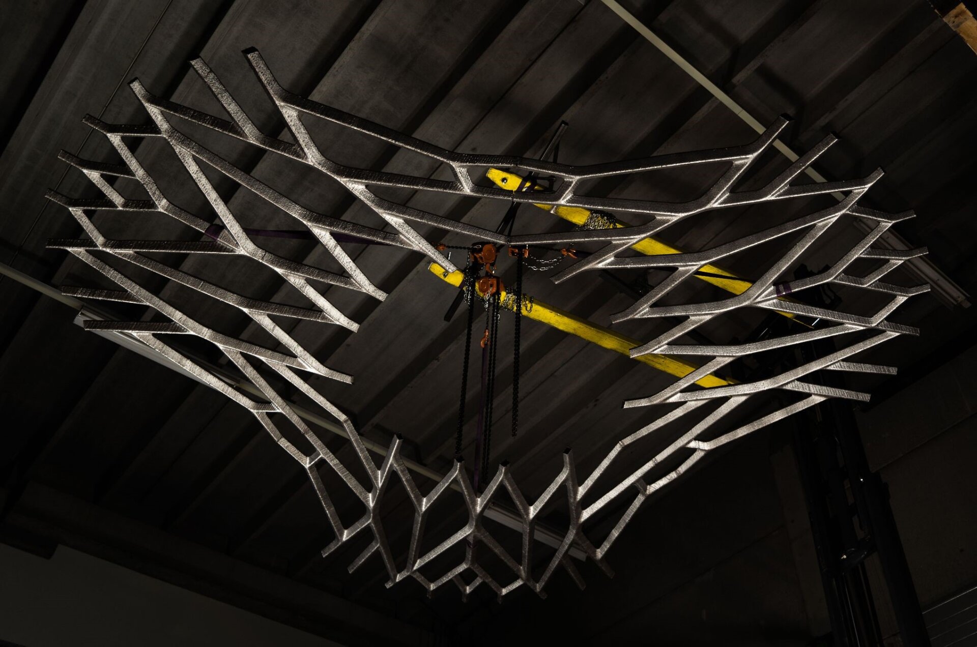 The component was built by MX3D, an Amersterdam-based 3D printing architecture and design firm specializing in Wire Arc Additive Manufacturing (WAAM). This process involves fusing metal wires with lasers to create lightweight metal objects with high structural strength. The company is renowned for creating the 3D printed metal bridge that spans the Oudezijds Achterburgwal canal in Amsterdam (shown below).
