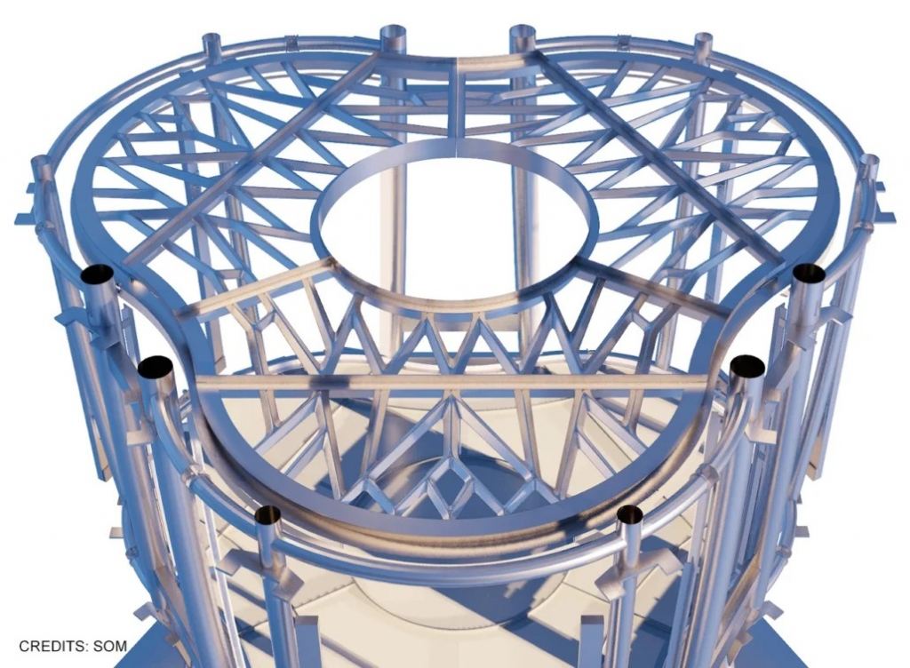 The floor component consists of six separate segments that were printed vertically before being welded together. When integrated with SOM's design for a four-story semi-inflatable habitat, the 3D printed structure will be supported by three columns and covered by a series of floor panels. Unfortunately, SOM could not feature it as part of their exhibit - titled " Life Beyond Earth " - but manages to convey the scale of the lunar habitats that they are developing. Said Daniel Inocente, SOM's Senior Designer for the study: