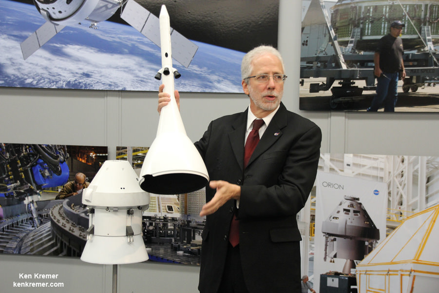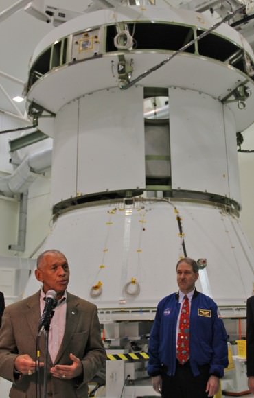 NASA Administrator Charles Bolden discusses NASA's human spaceflight initiatives backdropped by the service module for the Orion crew capsule being assembled at the Kennedy Space Center. Credit: Ken Kremer/kenkremer.com[/caption]