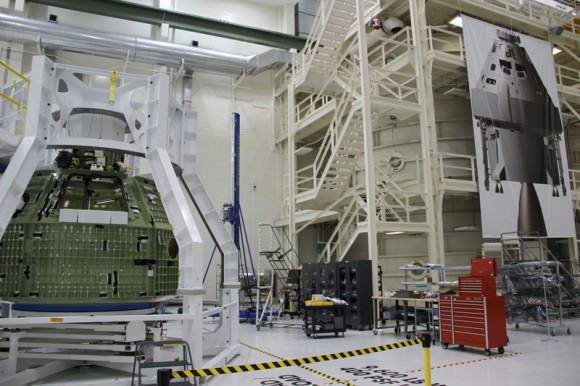 Orion EFT-1 crew cabin and full scale mural showing Orion Crew Module atop Service Module inside the O & C Building at the Kennedy Space Center, Florida. Credit: Ken Kremer/kenkremer.com[/caption]