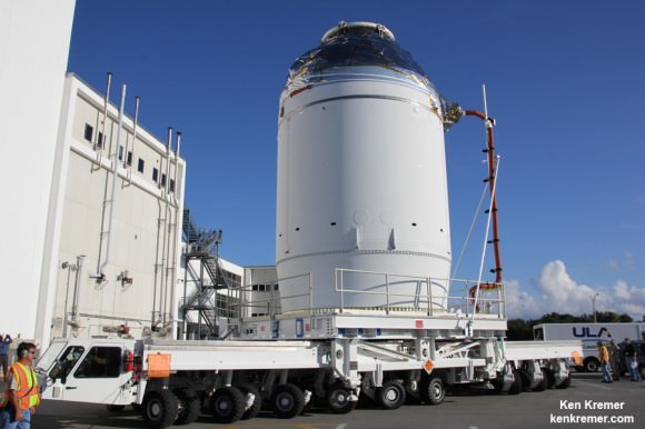 NASA's completed Orion EFT 1 crew module loaded on wheeled transporter during move to the Payload Hazardous Servicing Facility (PHFS) on Sept. 11, 2014 at the Kennedy Space Center, FL. Credit: Ken Kremer - kenkremer.com[/caption]