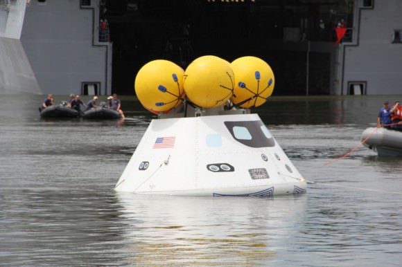 Dive teams attach tow lines to Orion test capsule during Aug. 15 recovery test at Norfolk Naval Base, VA. Credit: Ken Kremer/kenkremer.com[/caption]