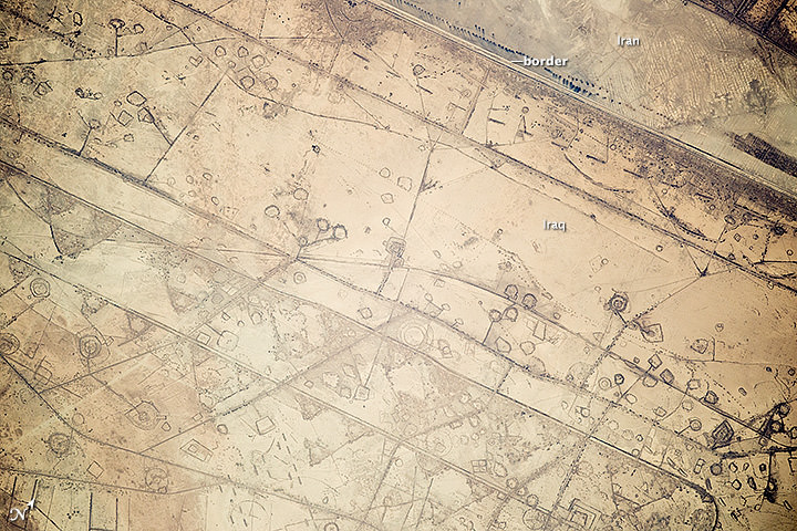 Astronauts aboard the International Space Station took this photograph in November of 2014 of a 20-kilometer (12-mile) stretch of the Iraq-Iran border, near the coast of the Persian Gulf. Clearly visible is the border between the two countries, along with signs of fortification: circular gun emplacements, systems of large curved earthworks and straight connecting roads that run parallel to the border.