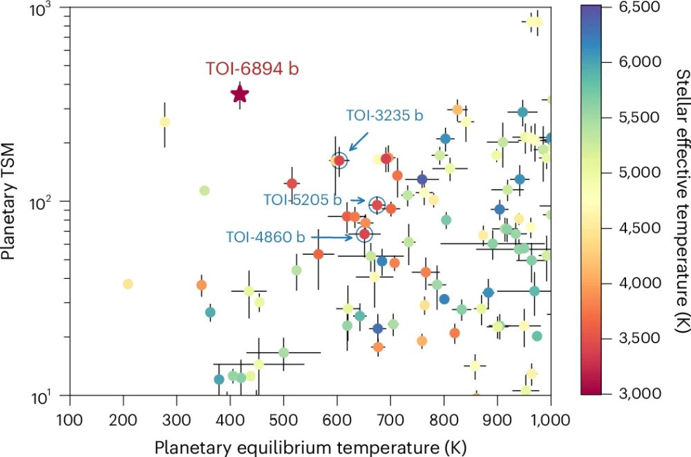 This figure shows the Transmission Spectroscopy Metric (TSM) of known giant planets as a function of the planetary equilibrium temperature. The TSM is basically a measure of how strong the signal-to-noise ratio is. The coloured points show the host star's temperature, and the star symbol denotes TOI-6894 b. Blue circles and arrows highlight three known transiting giant planets with mid-M-dwarf host stars. Image Credit: Bryant et al. 2025. Nature Astronomy.