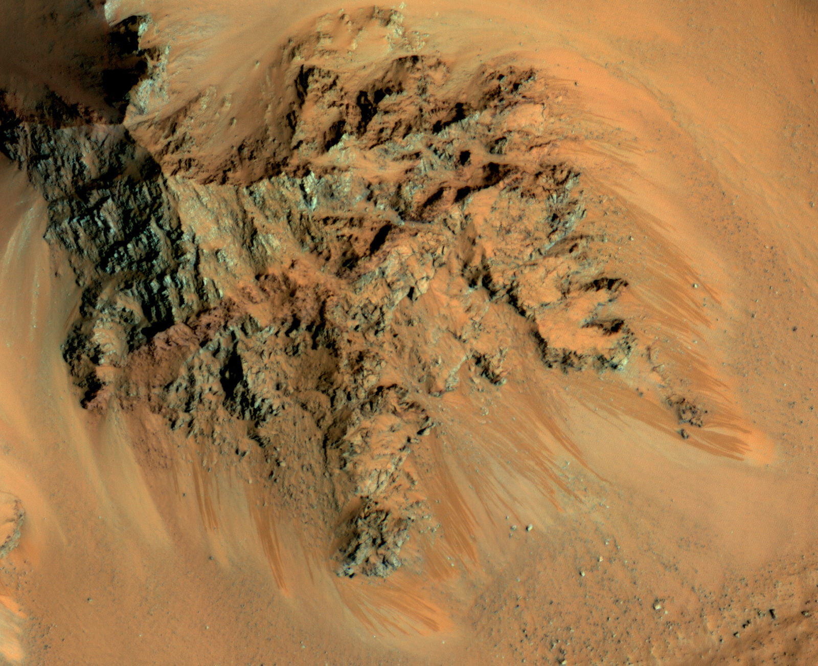 on Feb. 20, shows mountain peaks within the 150-km (93-mile) -wide Hale Crater. Made from data acquired in visible and near infrared wavelengths the long stains are very evident, running down steep slopes below the rocky cliffs.