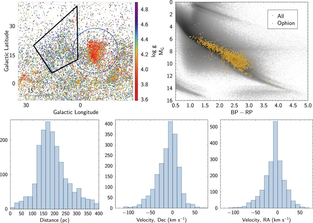 This figure from the research helps explain some of the findings. Ophion is in the black outline in the upper left, and the purple circle outlines a bubble around the star-forming Rho Ophiuchi Cloud. The upper right is an HR diagram of the stars in Ophion. The bottom row of panels shows the distances and velocities of the stars in Ophion. Image Credit: Huson et al. 2025, Astrophysical Journal.