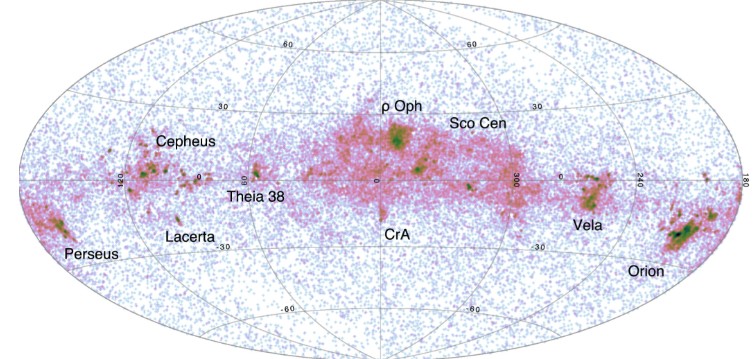 This all-sky map from the research shows the 220 million stars in the study. The darker the colour, the greater the density. The rapidly dissipating group is named Ophion and is near the star-forming region p Oph. Image Credit: Huson et al. 2025, Astrophysical Journal.
