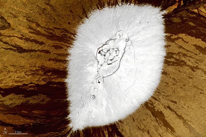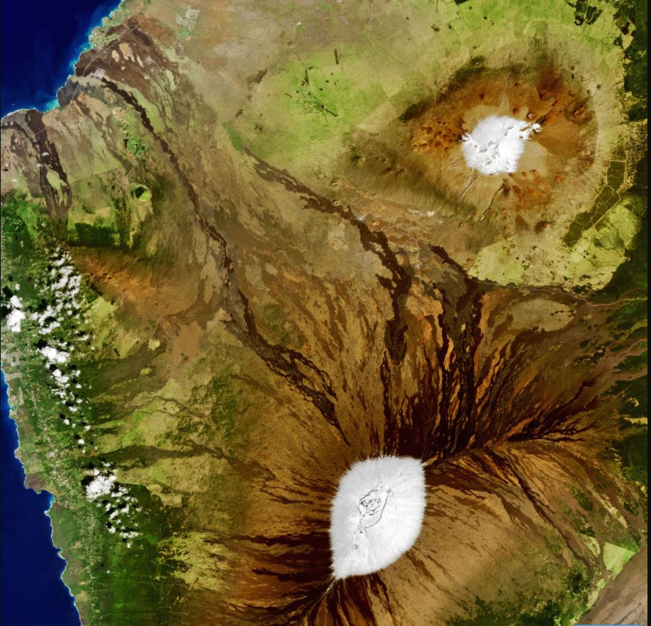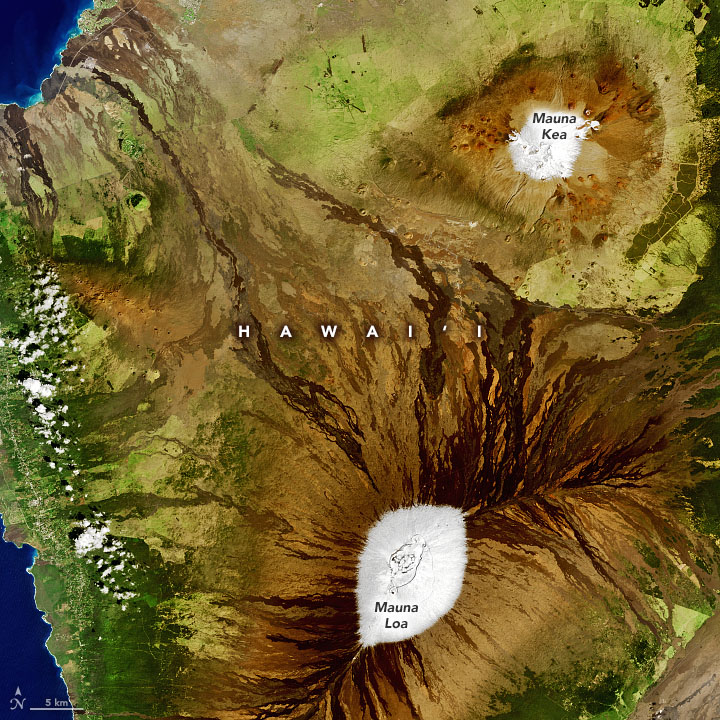 In this image from February 6, 2021, the Operational Land Imager (OLI) on Landsat 8 acquired natural-color images of the Big Island showing abundant snow on the two peaks. Nearly every year, Mauna Kea and Mauna Loa -- with elevations at about 13,600 feet/4,200 meters receive at least a dusting that lasts a few days. But this year, the snow has been more like a winter blanket of snow.