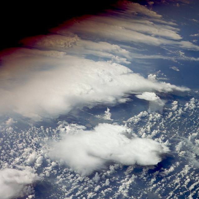 Here's a photo of thunderstorms above the Gulf Coast near Galveston Bay. These thunderstorms build in the morning out over the ocean and then move inland as the day warms up. This photo was taken from the space shuttle during mission STS-40.