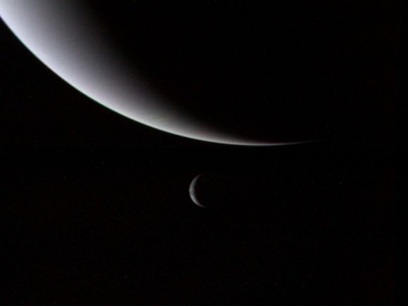 Neptune and its large moon Triton as seen by Voyager 2 on August 28th, 1989. (Credit: NASA).[/caption]