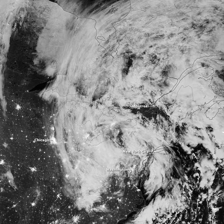 Sandy's clouds stretched from Hudson Bay to Chicago and Washington. Clusters of lights gave away the locations of some cities throughout the region; but along the East Coast, clouds mostly obscured the lights, many of which were blacked out due to the storm. On October 31, the Wall Street Journal reported that several million customers in multiple states were without electricity.