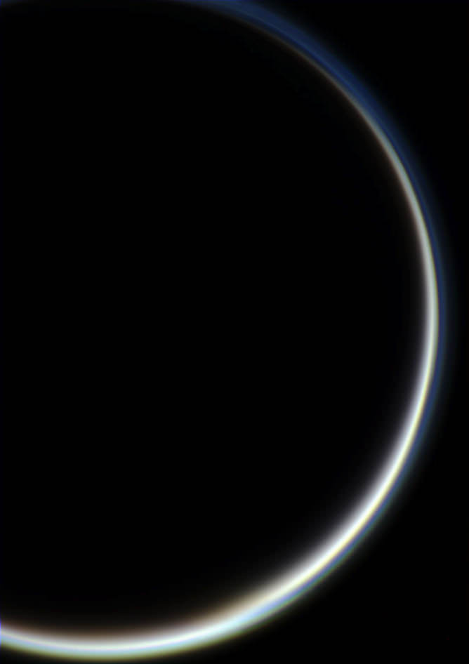 images, this is a color-composite showing a backlit Titan with its dense, multi-layered atmosphere scattering sunlight in different colors. Titan's atmosphere is made up of methane and complex hydrocarbons and is ten times as thick as Earth's. It is the only moon in our solar system known to have a substantial atmosphere.