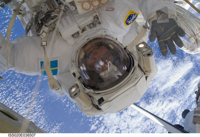 Above, ESA astronaut Christer Fuglesang works (and waves) during the third and final EVA of the mission. Fuglesang and NASA astronaut John "Danny" Olivas installed several items and did work to prepare for the installation of Node 3, which will take place next year.
