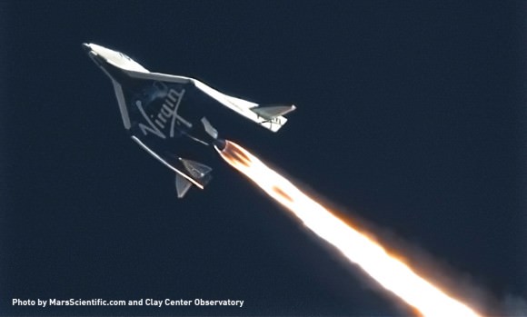 Feathered Flight during Virgin Galactic's SpaceShipTwo's third powered flight on January 10, 2014, over the Mojave desert. This image was taken by MARS Scientific as part of the Mobile Aerospace Reconnaissance System optical tracking system.[/caption]